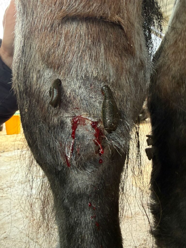 Nach dem Abfallen des Blutegels kommt es zu einer Nachblutung der Bissstelle. Diese ist ein natürlicher Bestandteil der Anwendung und kann je nach Tier, Hautbereich und Situation unterschiedlich stark und unterschiedlich lange ausfallen.